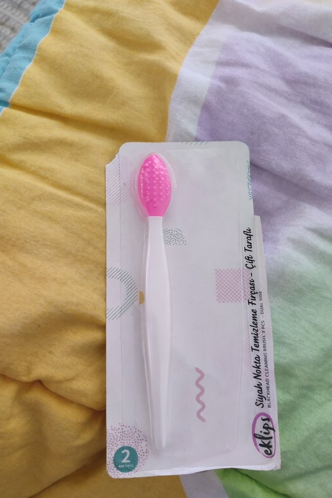 Pastel pembe renkte, siyah nokta temizleme fırçası. İnce beyaz sapı ile rahat tutuş sağlar.