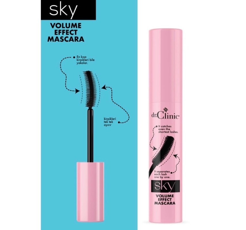 dr.Clinic Sky Hacim Maskara, pastel pembe kutusunda, kirpikleri tek tek ayırır ve en kısa kirpikleri bile yakalar.