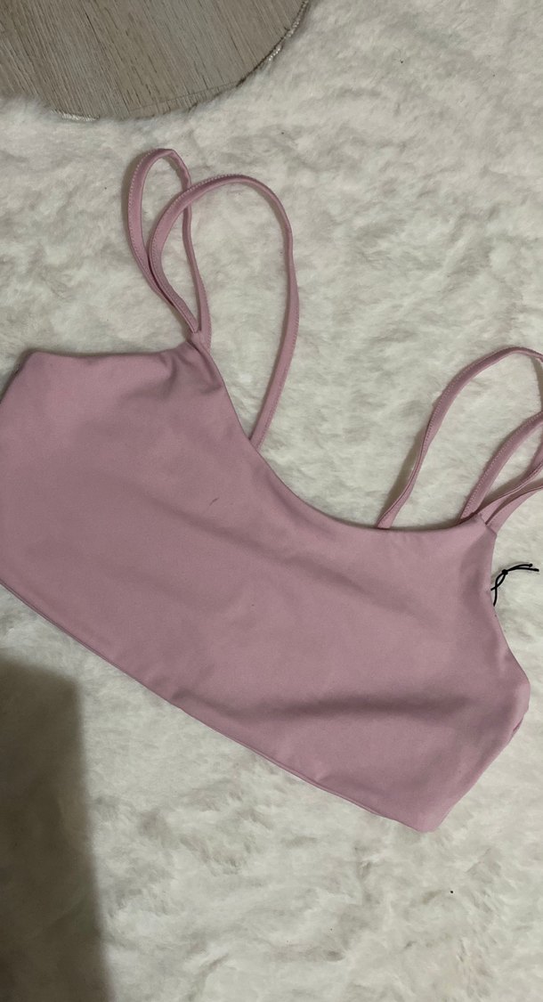 Pastel pembe renkte, ince askılı ve desensiz tasarıma sahip spor sütyeni, sokak modasına uygun.