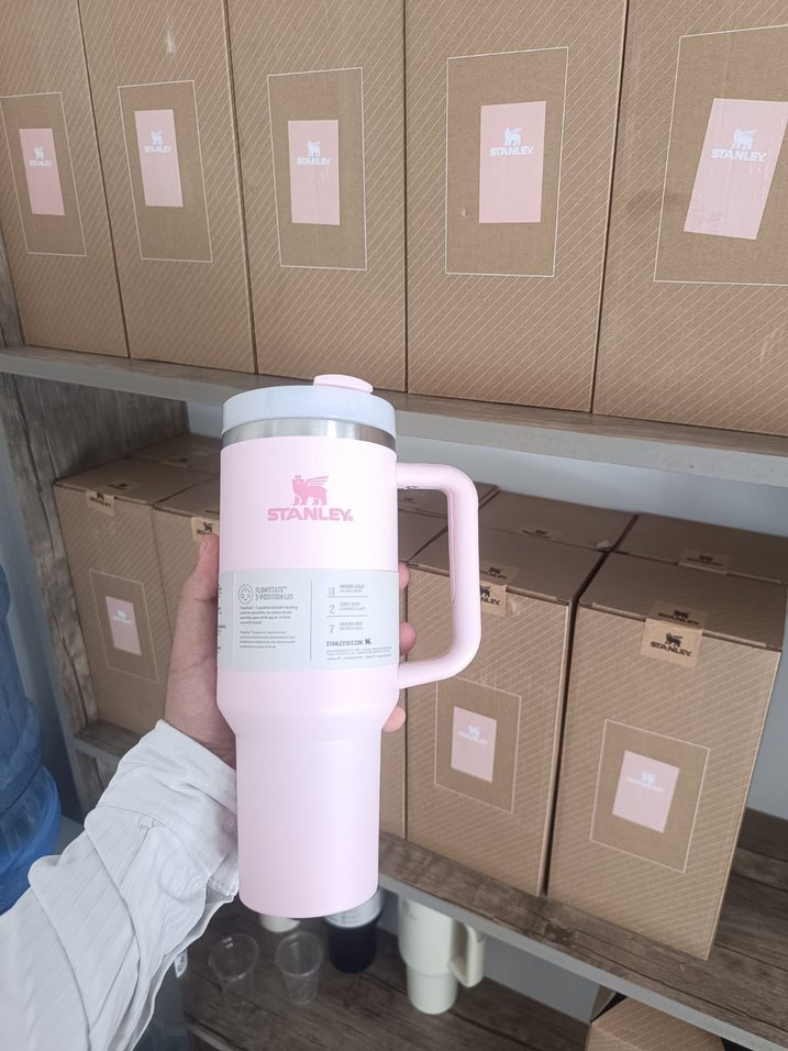 Pastel pembe renkte Stanley çocuk termosu, sağlam sap ve güvenli kapak ile içecekleri sıcak tutar. Dayanıklı yapısı günlük kullanım için uygundur.