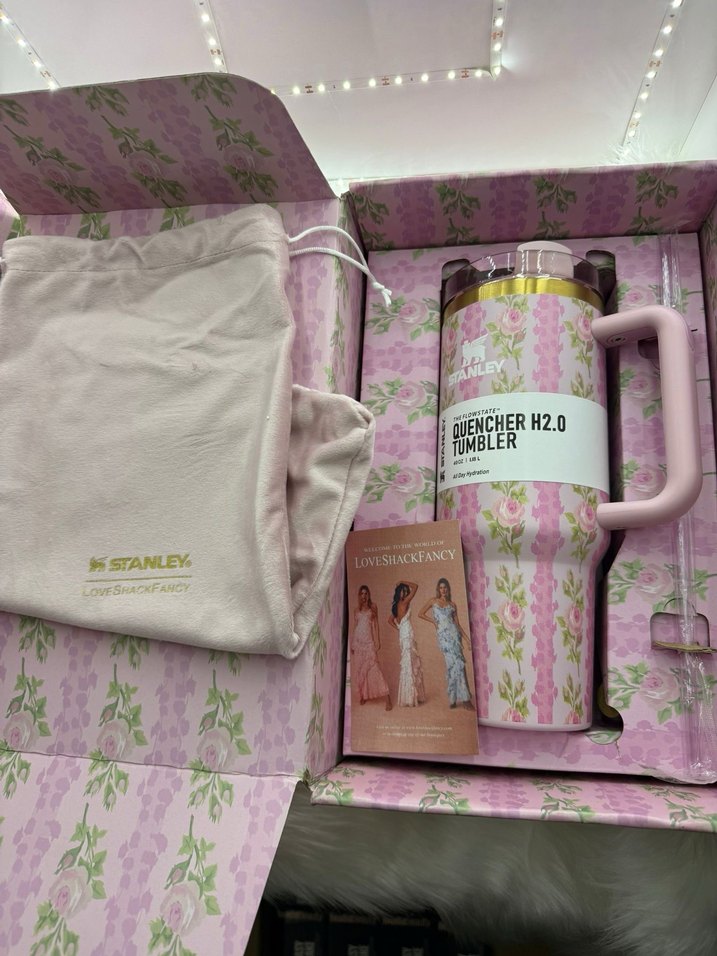 Pastel pembe renkte Stanley Quencher H2.0 termos, büyük saplı ve yumuşak kumaş kılıf ile birlikte gelir. İçecekleri sıcak veya soğuk tutar.