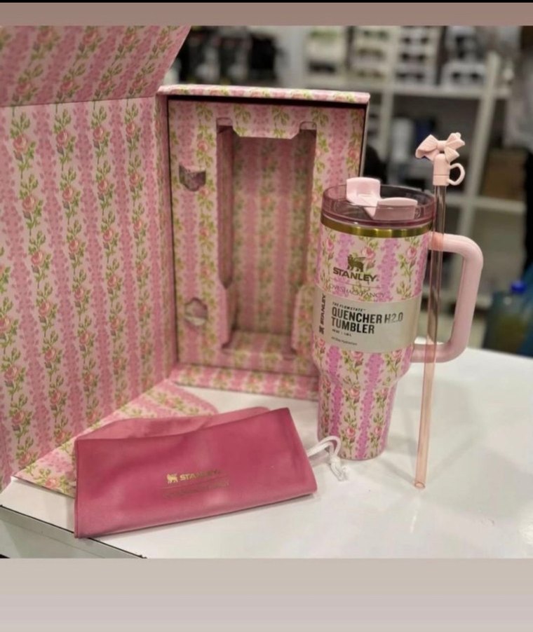 Pastel pembe renkte Stanley Quencher H2O termos bardak, kulplu ve fiyonk detaylı pipetli. Koruyucu kılıf ve dekoratif kutu ile birlikte gelir.