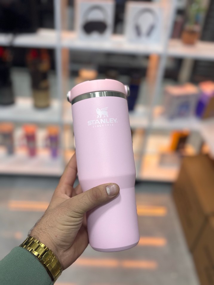 Pastel pembe renkte, dayanıklı Stanley termosu. Güvenli kapaklı, içecekleri sıcak veya soğuk tutar, taşımaya uygundur.
