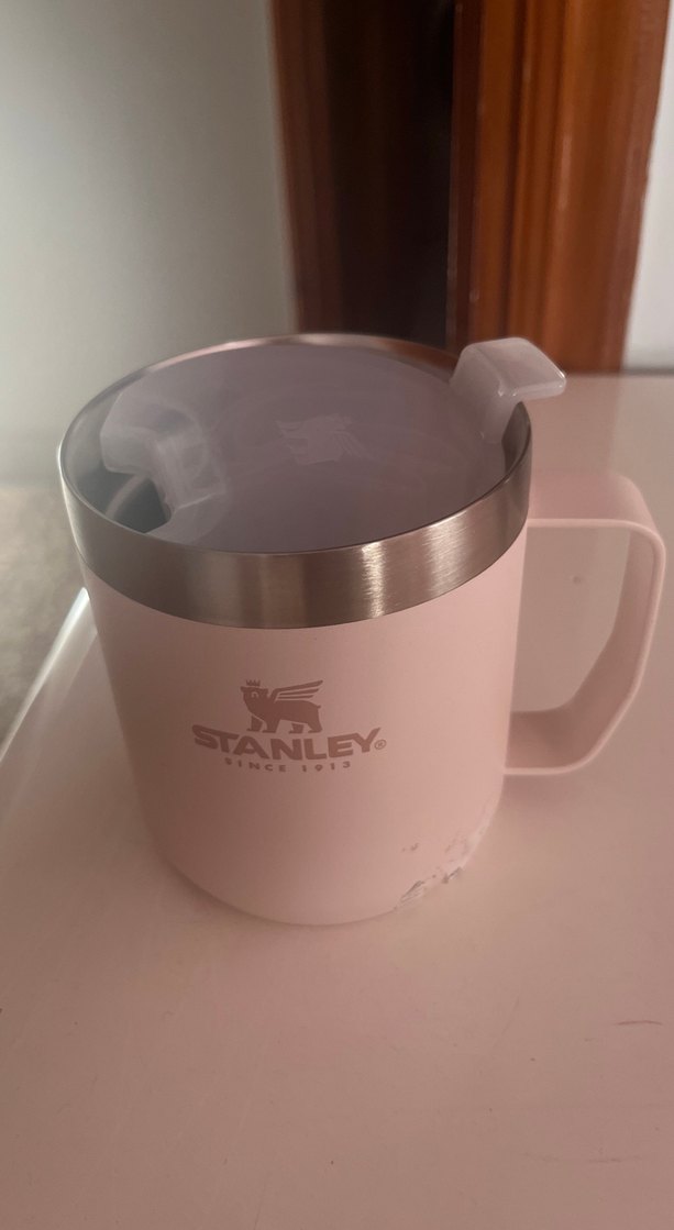 Pastel pembe renkte Stanley marka, sağlam kulplu ve paslanmaz çelik kapaklı termos kupa. Sıcak içecekler için uygundur. ☕