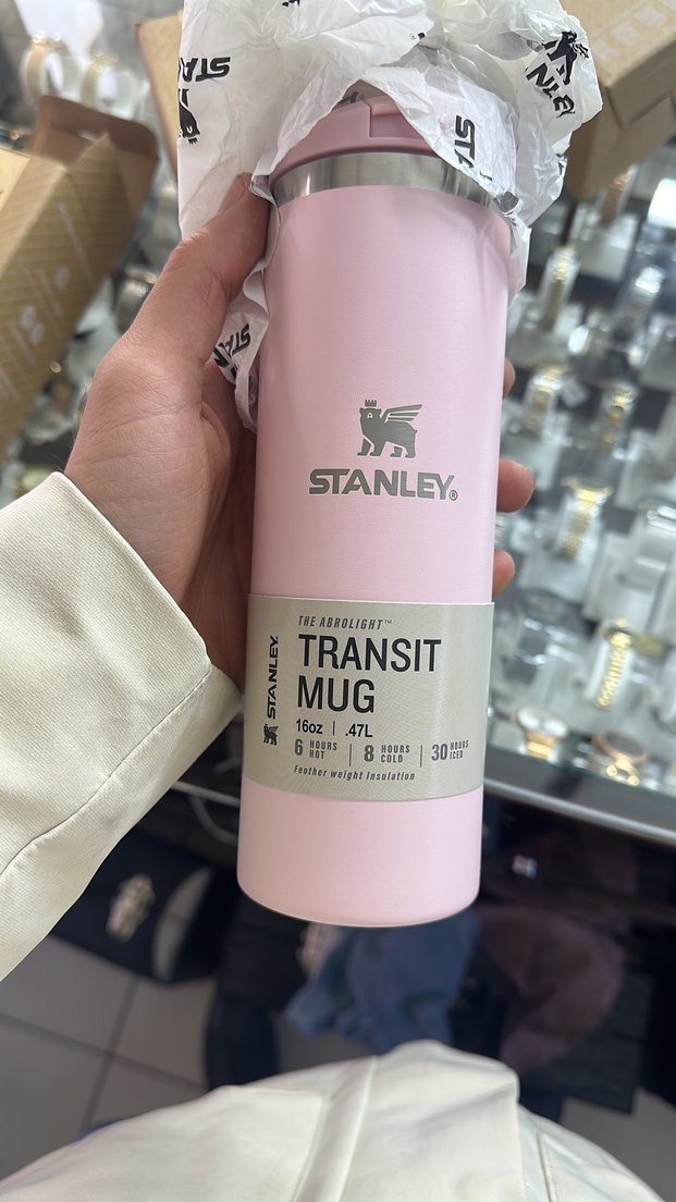 Pastel pembe renkli Stanley Transit Mug, 16oz (0,47L) kapasitelidir. İçecekleri 6 saat sıcak veya 8 saat soğuk tutar. Dayanıklı izolasyona sahiptir. ☕