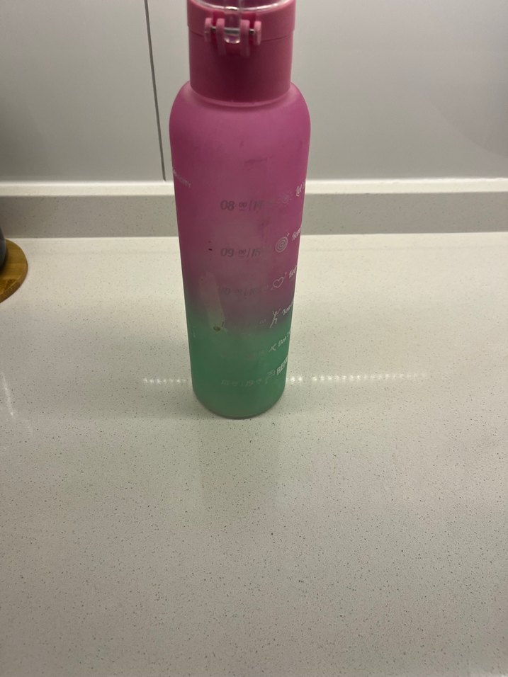 Pastel pembe ve yeşil tonlarında, üzerinde ölçü işaretleri bulunan suluk Kullanımı kolay, kapaklı tasarım.