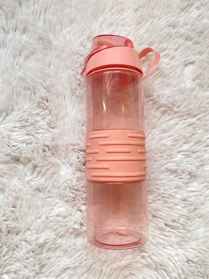 Pastel pembe renkte, şeffaf gövdeli, tutma bandı ve taşıma kulplu kapaklı suluk