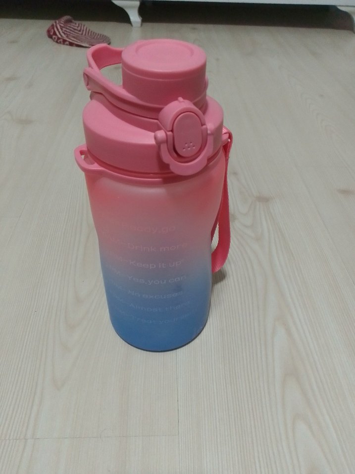 Pastel pembe renginde, kapaklı ve taşıma kayışlı suluk. Pembe ve mavi tonlarıyla yumuşak bir görünüme sahip.