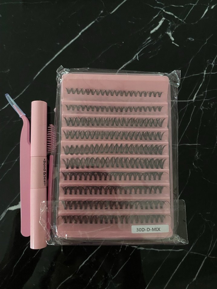 30D-D-MIX etiketli pastel pembe takma kirpikler, pembe aplikatör ve tarak ile birlikte sunuluyor.