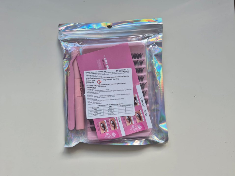 Pastel pembe renkte, farklı uzunluklarda takma kirpikler ve yapıştırıcı aplikatörler içeren set. Canlı ve yumuşak göz makyajı için uygundur.
