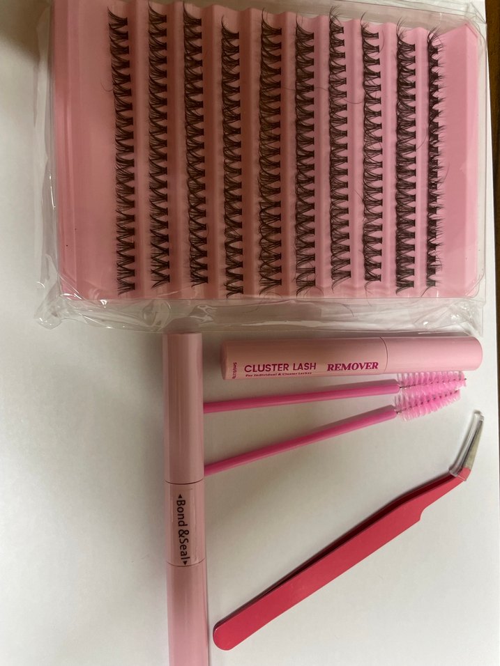Pastel pembe takma kirpik seti, çoklu kirpik kümeleri, çıkarıcı, yapıştırıcı, fırça ve eğik cımbız içerir.