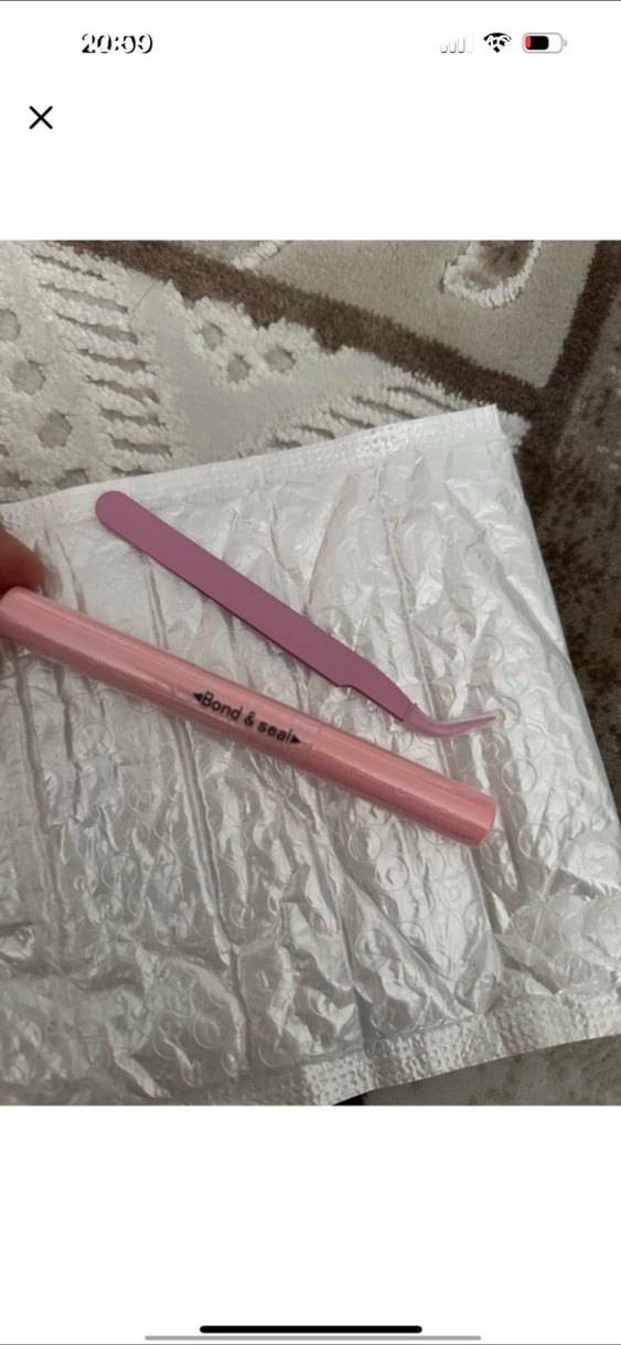 Pastel pembe takma kirpik yapıştırıcısı ve uygulama için kıvrık pens seti.