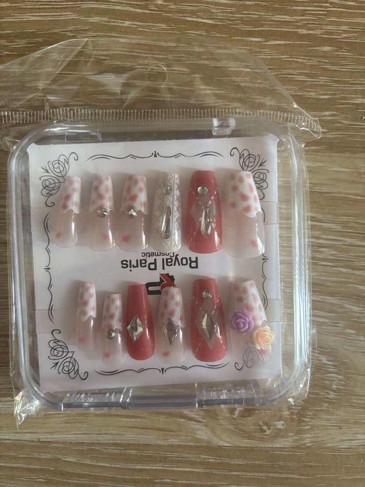 Pastel pembe renkte, taşlı ve çiçek detaylı takma tırnak süsleri seti. Zarif ve şık bir görünüm sağlar. Sıfır paketli.