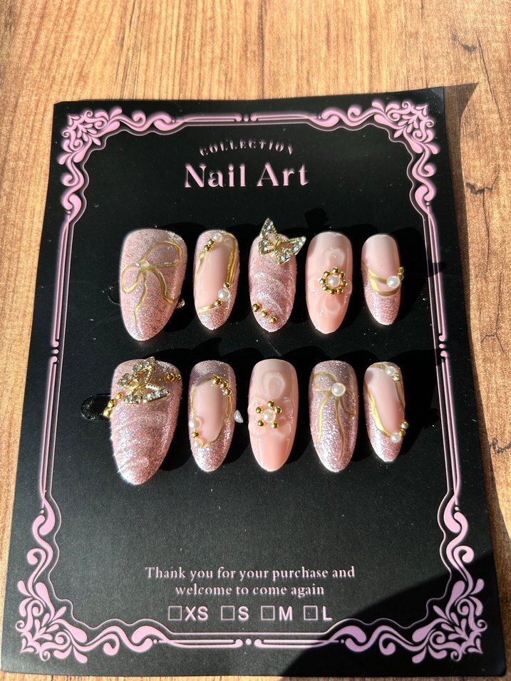 İnci ve altın detaylı, fiyonk ve çiçek desenli pastel pembe tırnak seti.