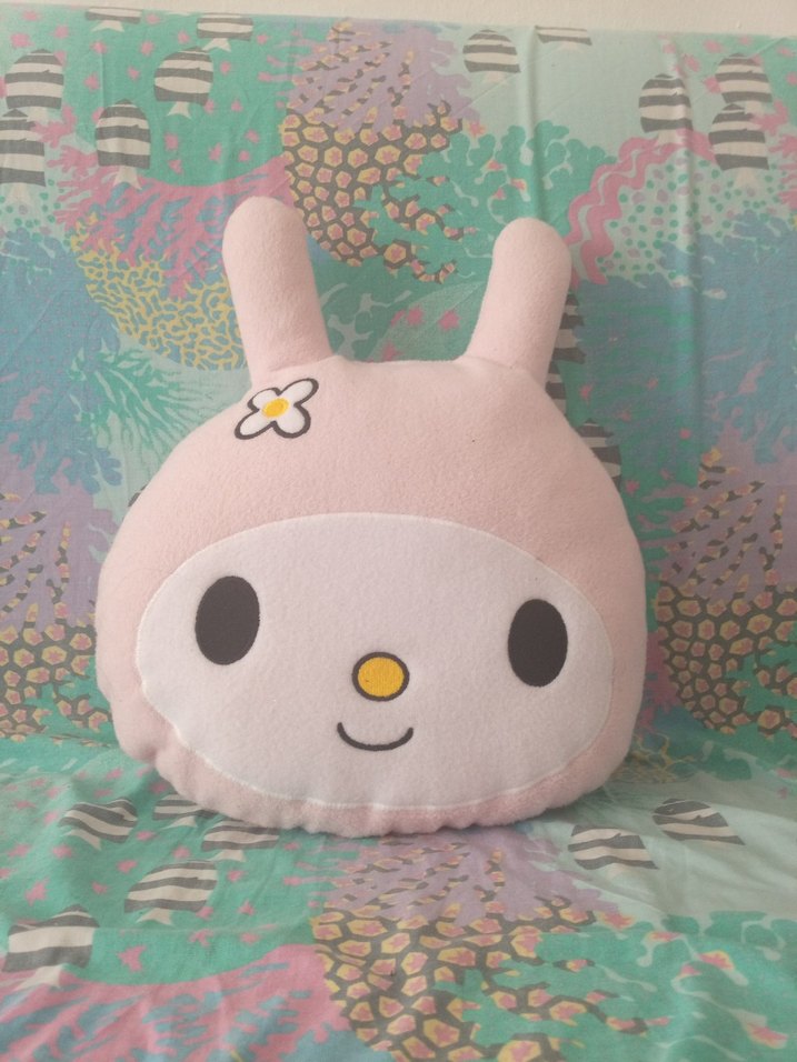 Pastel pembe renkte, kulaklarında çiçek detayı olan ve küçük sarı burunlu yumuşak tavşan şeklinde peluş oyuncak. Rahatlatıcı ve sarılmalık .