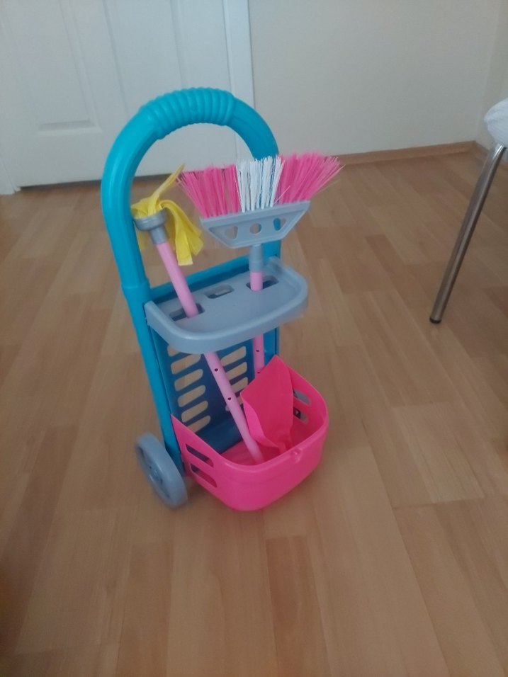 Pastel pembe oyuncak temizlik seti, mop, süpürge, kova Mavi sap ve çeşitli temizlik aksesuarları bulunur.