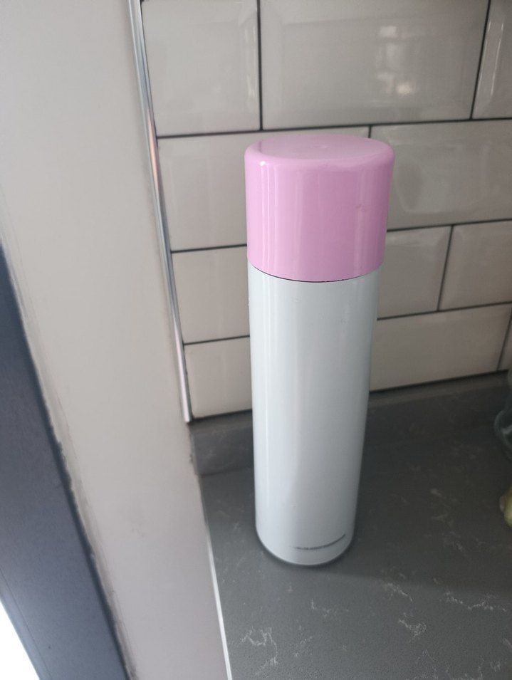 Pastel pembe kapaklı, beyaz gövdeli termosu. İçecekleri sıcak tutar, taşınması kolaydır.