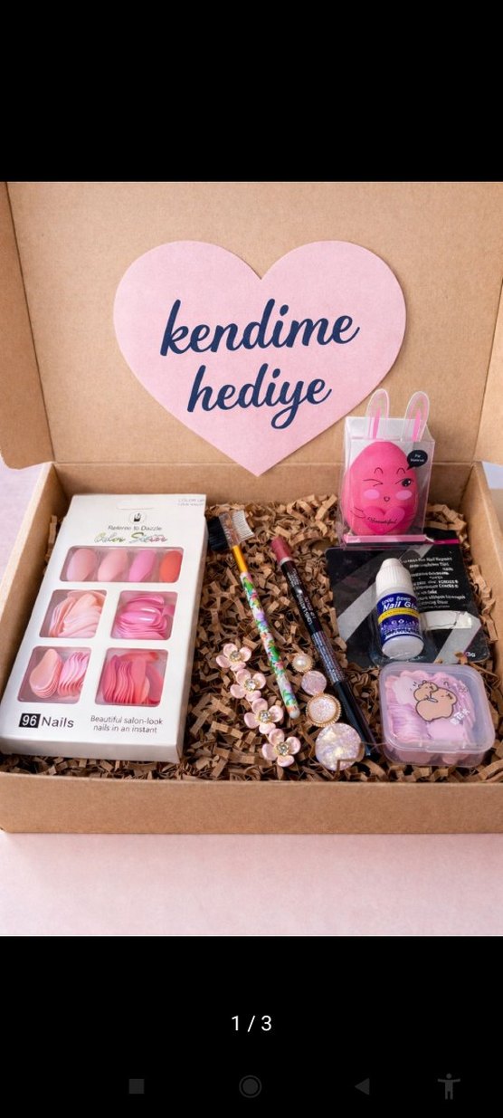 Pastel pembe canlı tırnak süslemeleri, yapay tırnaklar ve aksesuarlar içeren 98Nails marka hediye kutusu.