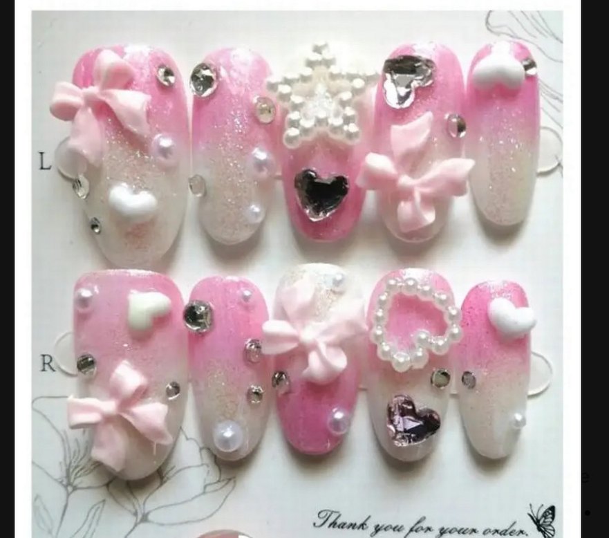 10 adet pembe renkli, 3D fiyonk, kalp, inci ve taş detaylı tırnak süsleri. Üzerinde "Thank" yazısı bulunur.
