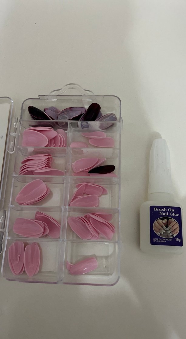Pastel pembe renkte farklı şekillerde tırnak süsleri ve kolay uygulama için fırçalı tırnak yapıştırıcısı içerir.