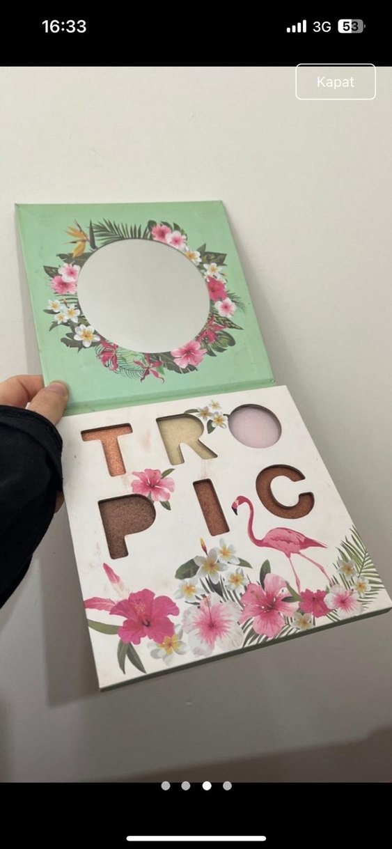 Pastel pembe tonlarda göz farları içeren, üzerinde tropikal çiçek ve flamingo desenleri bulunan, ayna içeren palet.