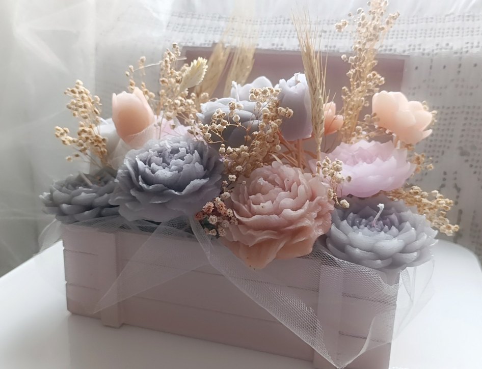 Pastel pembe ve gri çiçek şeklinde mumlar, hassas kuru çiçeklerle birleşerek yumuşak ve şık bir dekorasyon sunar. ister ahşap sandıkta ister hediye kutusunda