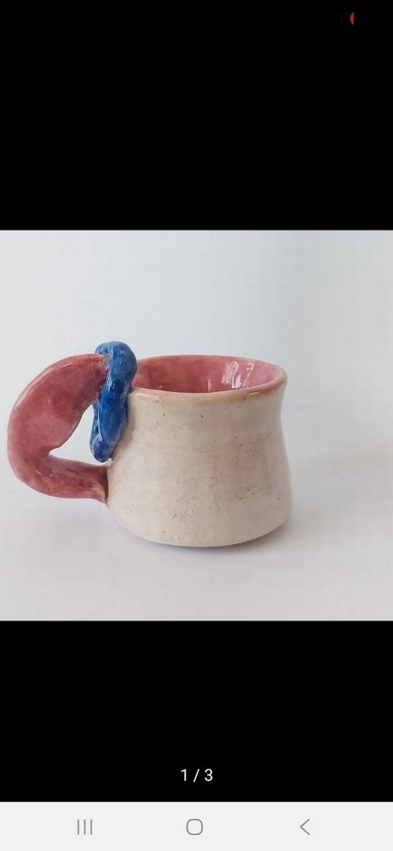Pastel pembe iç ve kulplu, mavi detaylı seramik kupa. Dış yüzeyi yumuşak beyazdır, el yapımı ve sanatsal bir görünüme sahiptir. ☕