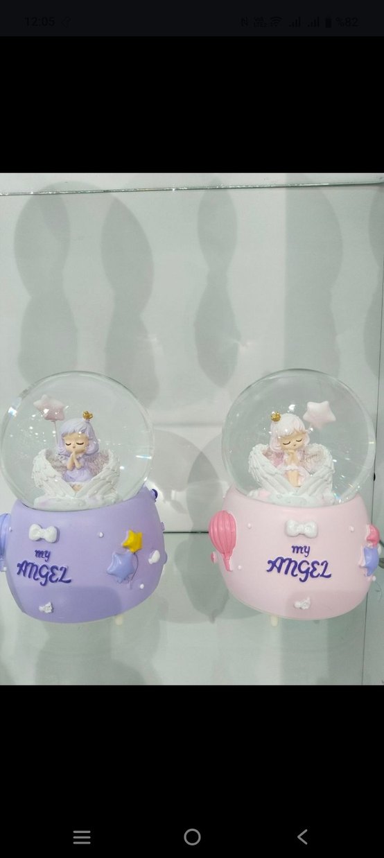 Pastel pembe ve mor renkte, içinde melek figürleri bulunan kar küreleri. Tabanlarında "my ANGEL" yazısı ve yıldız, bulut detayları bulunur. büyük boy ışıklı sesli kar püskürtme li ürün sıfır olup kendi kutusunda gelir ithal ürün dür