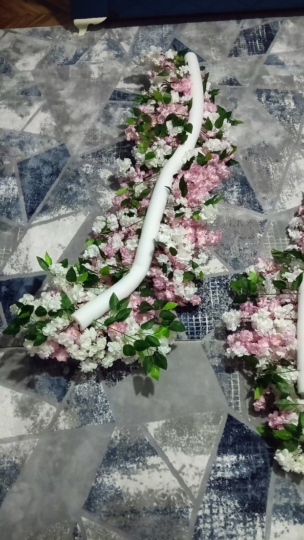 Yeşil yapraklarla birlikte pastel pembe yapay çiçeklerden oluşan akıcı tasarımlı dekorasyon.