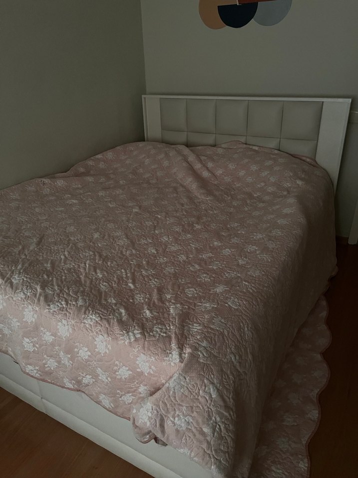 Pastel pembe renkte, desen içermeyen yumuşak dokulu yatak örtüsü. İki adet yastık kılıfı da mevcut bi kere çeyiz sermede kullanıldı yeni