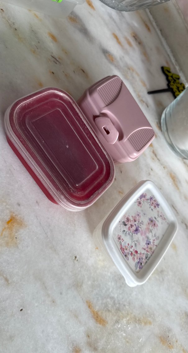 Pastel pembe renkli, kapaklı yemek saklama kapları seti, biri çiçek desenli. Yemek ve atıştırmalıklar için uygundur. Hepsi fiyatı