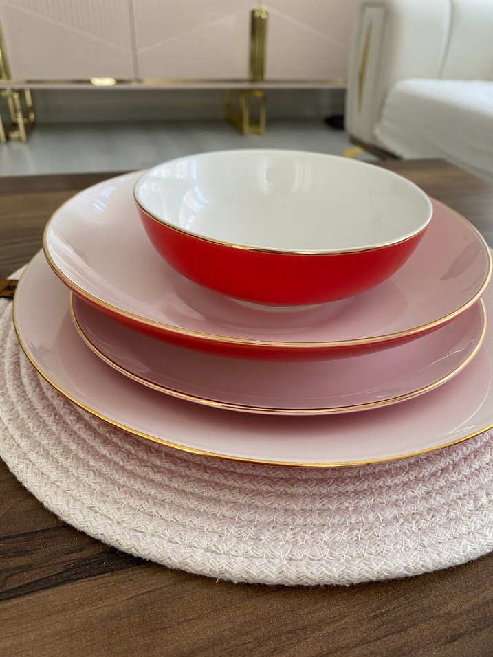 Altın detaylı kırmızı 6 kişilik Karaca yemek takımı, set içeriğinde 6 adet servis tabağı, 6 adet, çukur tabak, 6 adet pasta tabağı, 6 adet kase vardır, tuzluk, biberlik ve kürdanlık hediyesi