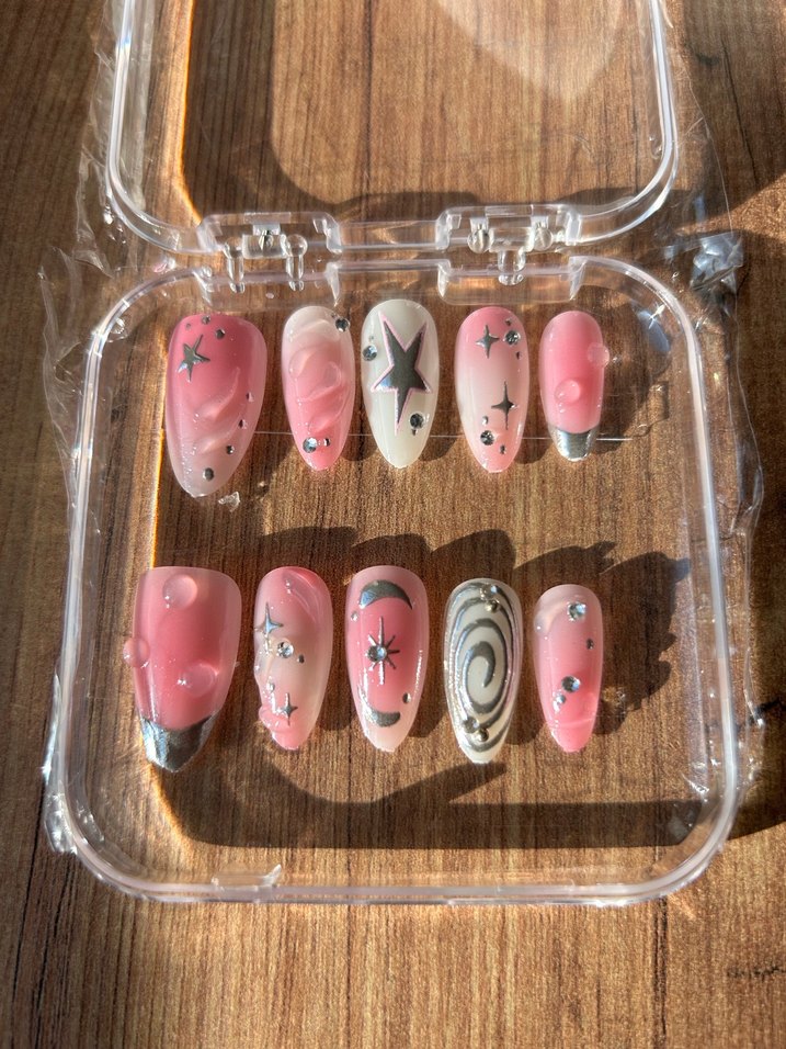 Pastel pembe renkte, yıldız desenli ve gümüş detaylı tırnak seti. Parlak yüzeyli farklı şekillerde, şeffaf kutuda saklanır.