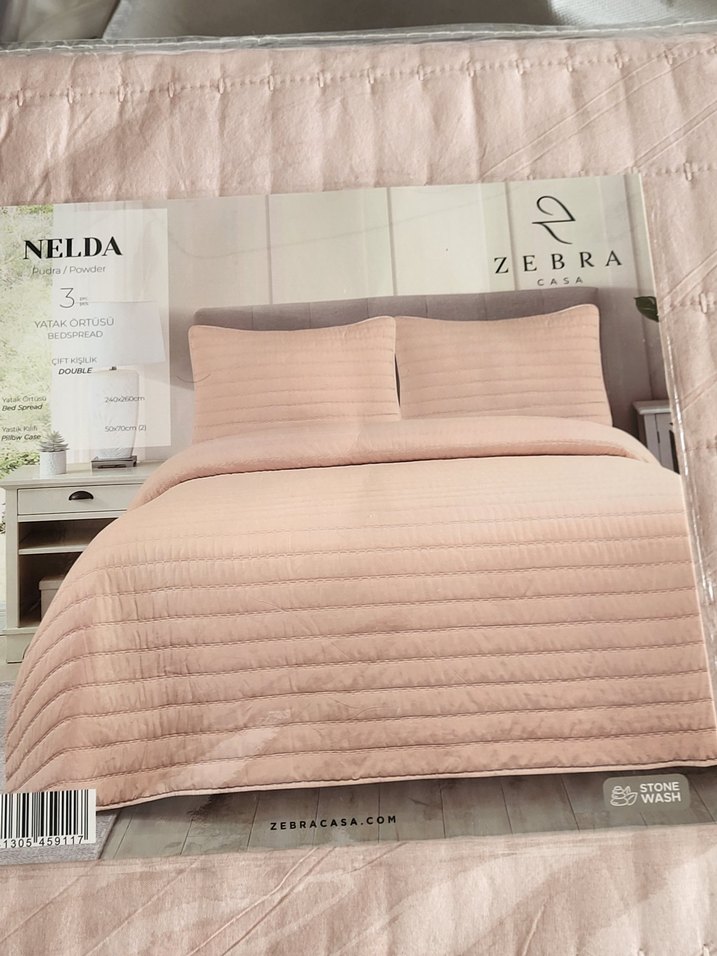 Pastel pembe, zebra desenli yatak örtüsü, yumuşak ve rahat dokulu. Uyumu sağlayan yastık kılıflarıyla birlikte. ️çift kişilik double