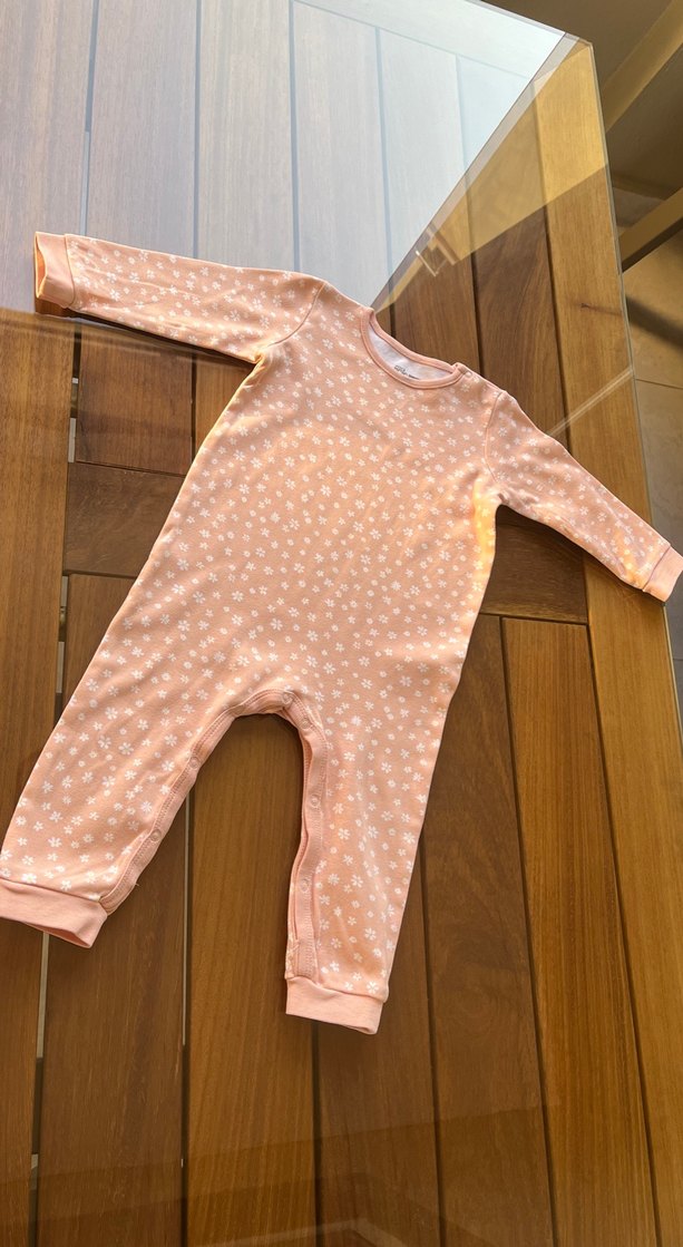 Pastel pudra pembe renkte, düğmeli ve uzun kollu bebek kız tulumu. Yumuşak kumaştan, hafif çiçek desenli.