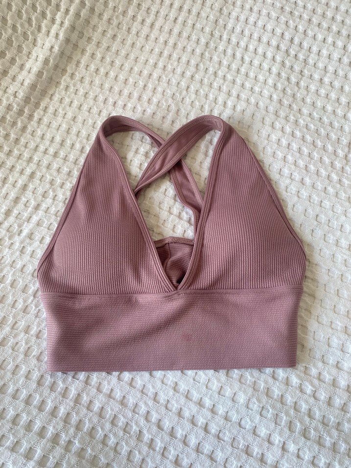 Pastel pudra renkli, sırt kısmı çapraz askılı, normal boy ve sokak stili atletik bralet.