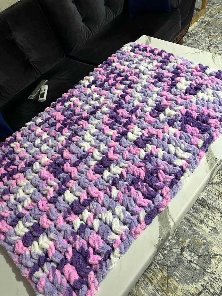 Yumuşak, kalın örgü dokusuyla pastel mor, pembe ve beyaz tonlar içeren bebek battaniyesi. İstenilen renkte örülür.