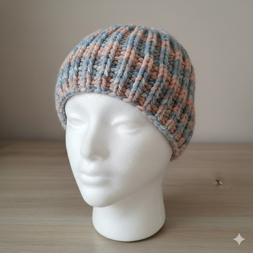 pastel renklerde tek yumaktan oluşan bere el örgüsüdür.