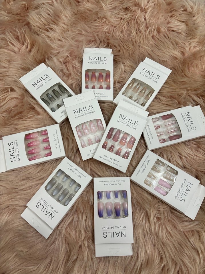 Pastel renklerde çoklu tonlarda, doğal tasarımlı tırnak süslemeleri. Her kutuda "NAILS" yazısı bulunur ve şık, yumuşak renkler sunar. Adet fiyat Çoklu alımda indirim yapılır