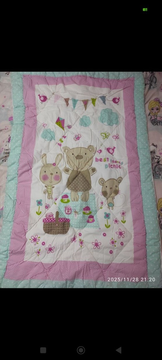 Pastel çok renkli pamuklu ve elyaf bebek yorgan ve nevresim takımı, sevimli hayvan teması içerir. Yumuşacıktır.