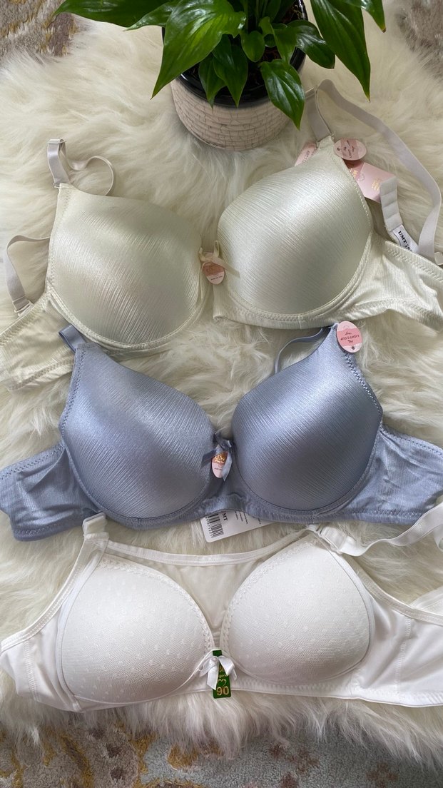 Pastel beyaz ve açık mavi tonlarda, desen içermeyen, modern klasik tarzda sütyenler. Normal uzunlukta ve konforlu bir yapıya sahip. Parlak ve şık dokuya sahiptir