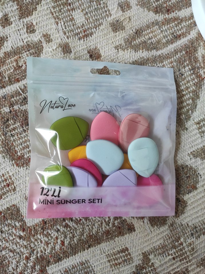Farklı şekillerde, pastel renklerde 12 mini makyaj süngerinden oluşan set. Yumuşak dokulu ve çok renkli.