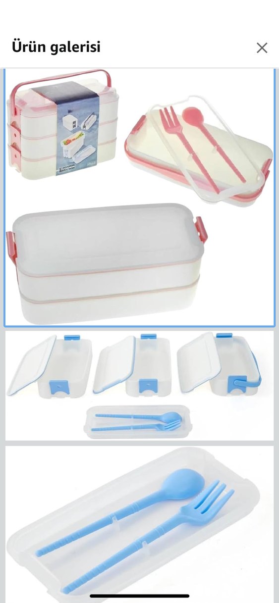 Pastel renkli beyaz 3 katlı yemek kapları ve kapaklı, çatal-kaşık seti ile birlikte gelir. Yemekleri düzenlemek için uygundur. 2 rengi vardır penbe olan ve gri olan