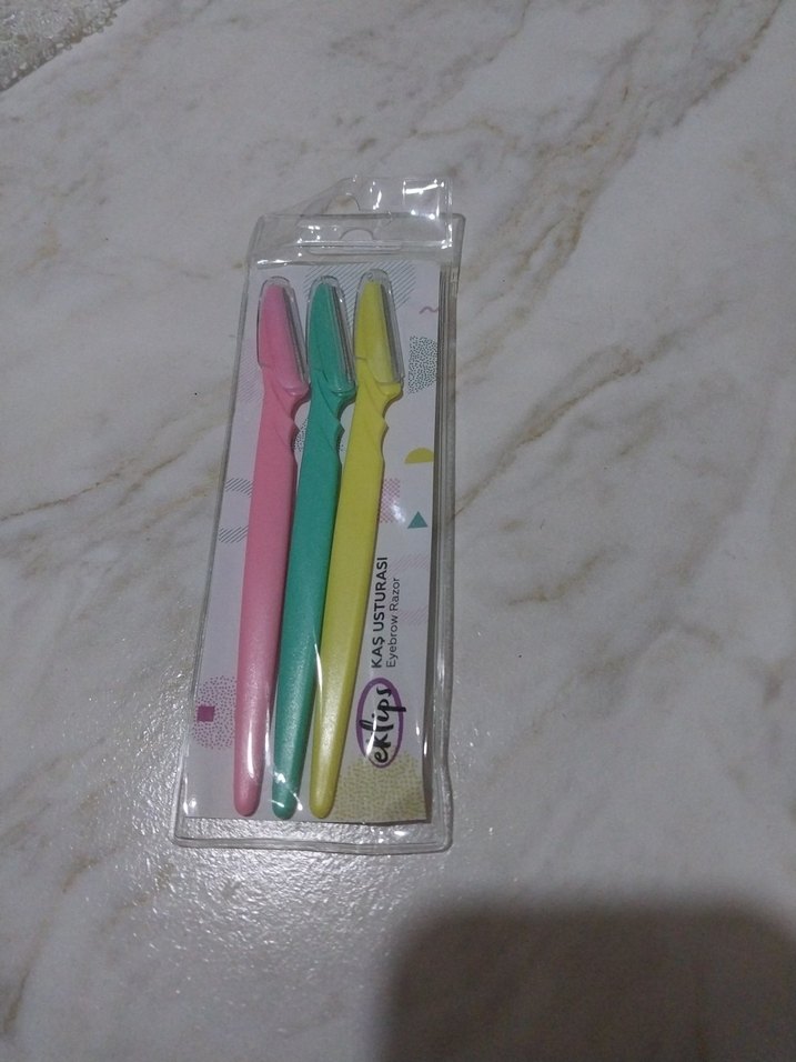 Üç adet pastel renkli (pembe, yeşil, sarı) kaş ustura seti. Her biri cilt bakımı için ince uçlu tasarlanmıştır.