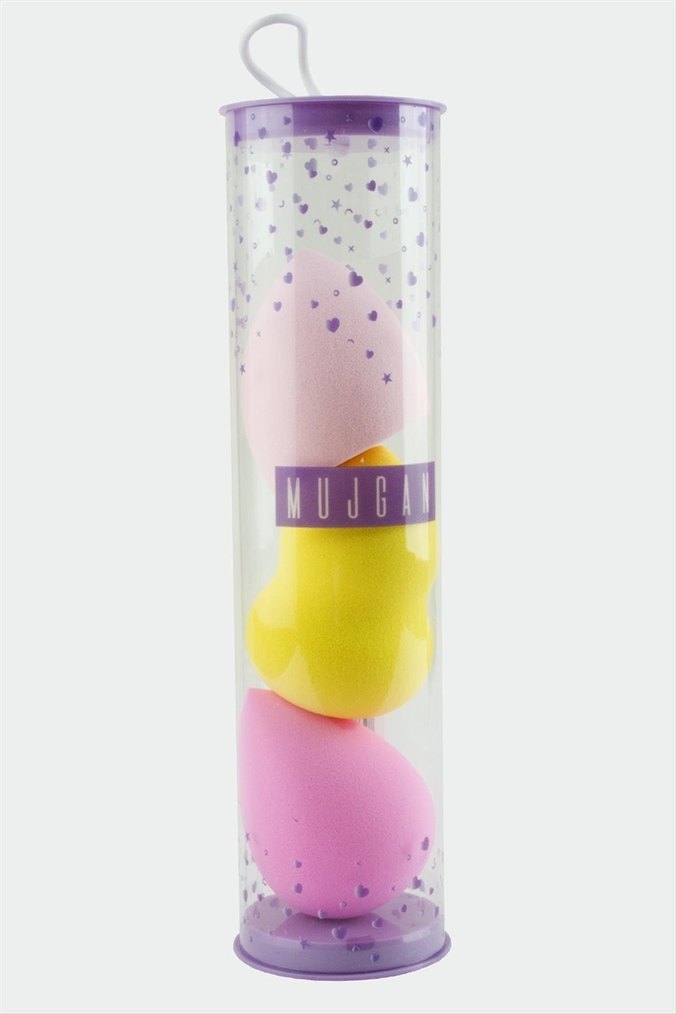 Şeffaf silindirik kutuda üç pastel renkli makyaj süngeri seti, pürüzsüz makyaj uygulaması için uygundur.