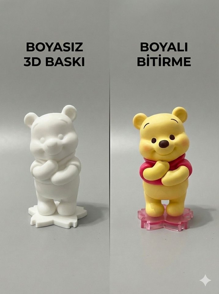 Pastel beyaz renkte, boyasız ve boyalı seçenekleriyle 3D baskı ayıcık figür. Boyalı versiyon canlı renkler ve detaylı görünüme sahip.