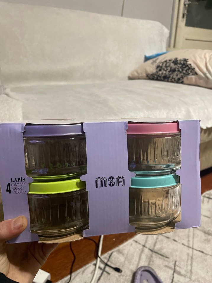 LAPis markalı, pastel renkli kapaklara sahip 4 adet cam saklama kabı seti. Her kabın hacmi 400 cc'dir.