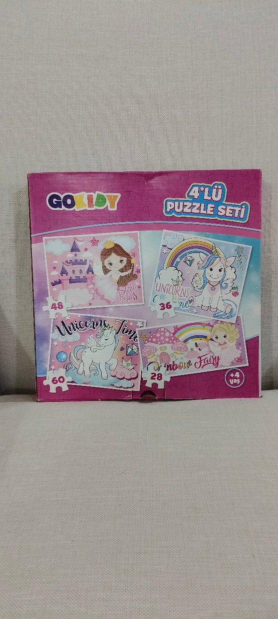 Pastel renkli 4'lü puzzle seti, unicorn ve peri temalı, 28-60 parça arasında değişen parçalar içerir. 4 yaş ve üzeri çocuklar için uygundur. eksik parça yok temiz ve sorunsuzdur