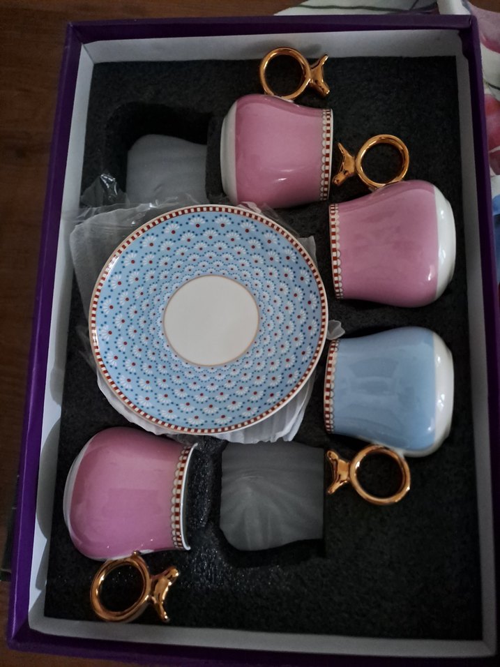 Altın renkli kulplara sahip 4 pastel renkli kahve fincanı ve desenli bir tabağı içeren set. Pembe ve mavi fincanlar şık bir tasarıma sahiptir. ☕ bana fazla almak isteyene tek tek yada bu sekilde kutuda gorundugu gibi 4 lu de gonderebilirim fiyat temsilidir lutfen sorunuz