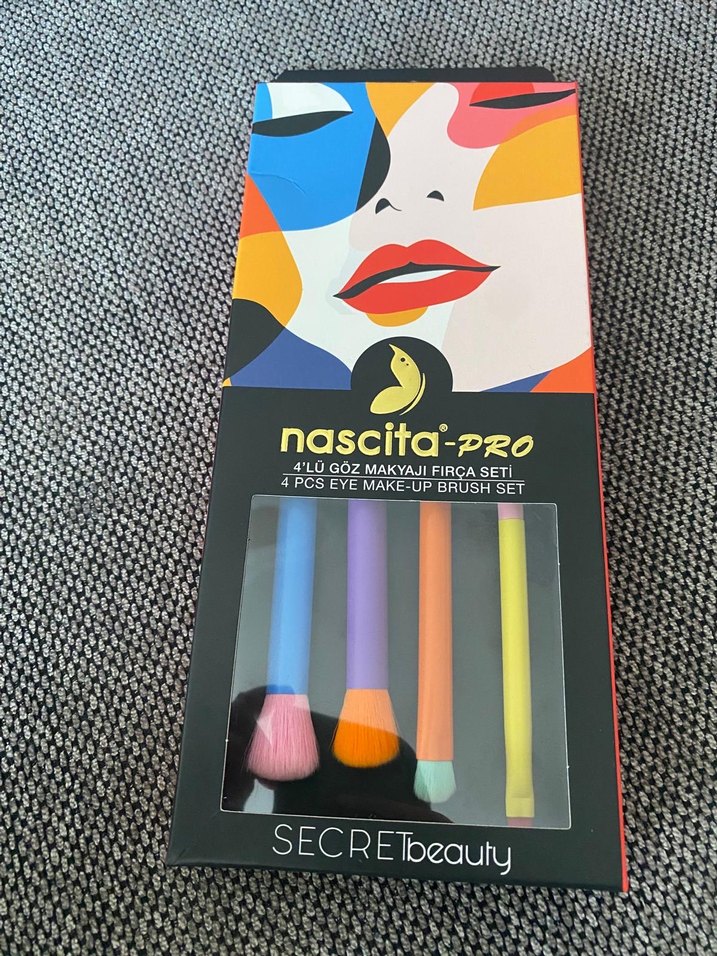 Yumuşak kıllara sahip, pastel renklerde 4 parçadan oluşan göz makyaj fırça setidir. nascita-pRo ve SECRETbeauty markalıdır.